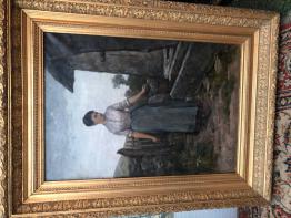 Louis Hilaire CARRAND (1821-1899) "Le parapluie rouge" Huile sur carton Signature en bas à droite Cadre 79 cm x 63.5 cm Panneau 50 x 66 cm (éraflures sur le vernis : voir photos)