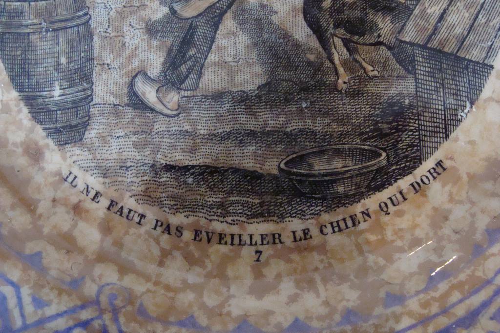 Assiette ancienne "parlante" en faïence série "Proverbes et paysans" de 19cm de diamètre de Creil et Montereau ; une patine naturelle ancienne lui rajoute beaucoup de charme.