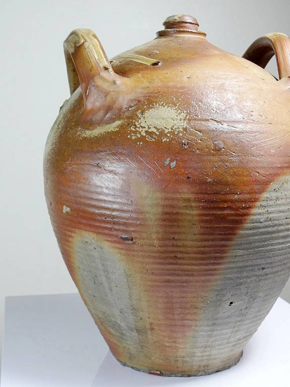 Très belle jarre à huile, à cidre ou autre, format xXL (~15-18 litres) grès ancien XIXe fabrication française artisanale Puisaye, semi vernissé/émaillé. Grand corps ventru, petit goulot court encadré de 2 grandes anses arrondies. Grès gris/terracotta clair, reste du corps émaillé dans des nuances de roux, rouille, kaki clair, beige, gris, quelques traces d'émail. Environ 35-38cm de hauteur totale, diamètre max 27-28cm. Très bel état de conservation, cependant quelques défauts et usures du temps notamment quelques rayures plus ou moins visibles, petits chocs et traces de frottements sur le corps. Ensemble harmonieux. 5-6kg environ.