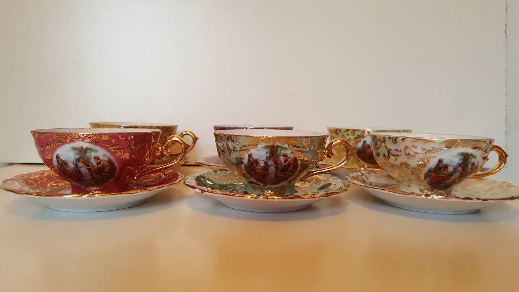 Très jolies tasses et soucoupes vintage en porcelaine irisée de Bavière. 6 couleurs différentes. Wiuterliug Kirchenlomitz Bavaria. Quantités : 6 tasses et 6 soucoupes